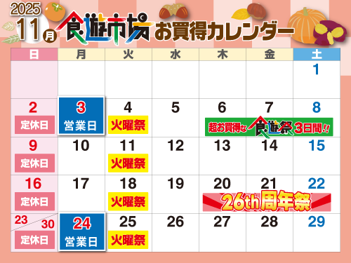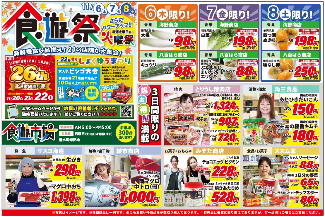 HOME 食遊市場からのお知らせ 火曜祭のチラシを公開しました。 食遊祭のチラシを公開しました。 第26回 周年祭開催!!イベント日は11/22土曜日 詳細はコチラ リサイクルステーション OPEN!ご家庭にある資源を回収いたします。お買い物のついでに、ぜひお気軽にご利用ください。 食遊市場公式インスタグラムはじめました!随時お買い得情報満載!!是非ともご覧ください!! 下の画像をクリックすると拡大表示されます。 チラシ表面の保存用データはこちらから! 下の画像をクリックすると拡大表示されます。 チラシ裏面の保存用データはこちらから! フロアマップのPDFはこちら 店舗情報はこちら