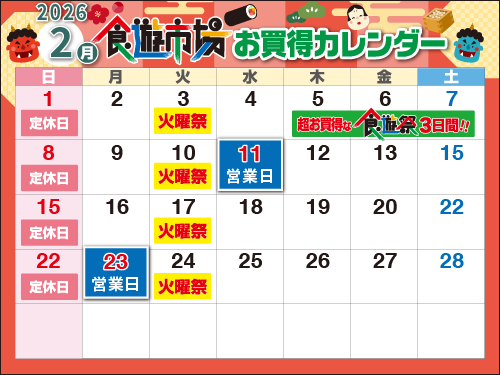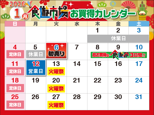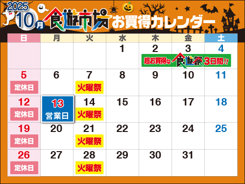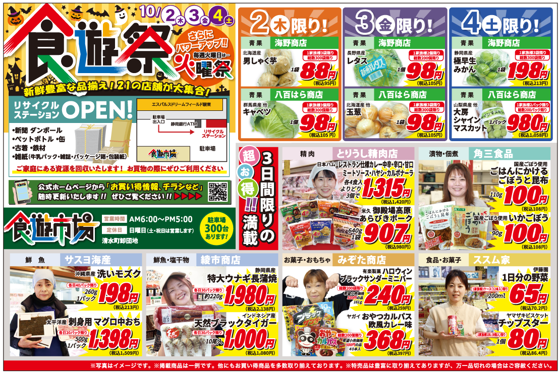 HOME 食遊市場からのお知らせ 火曜祭のチラシを公開しました。 食遊祭のチラシを公開しました。 リサイクルステーション OPEN!ご家庭にある資源を回収いたします。お買い物のついでに、ぜひお気軽にご利用ください。 食遊市場公式インスタグラムはじめました!随時お買い得情報満載!!是非ともご覧ください!! 下の画像をクリックすると拡大表示されます。 チラシ表面の保存用データはこちらから! 下の画像をクリックすると拡大表示されます。 チラシ裏面の保存用データはこちらから! フロアマップのPDFはこちら 店舗情報はこちら
