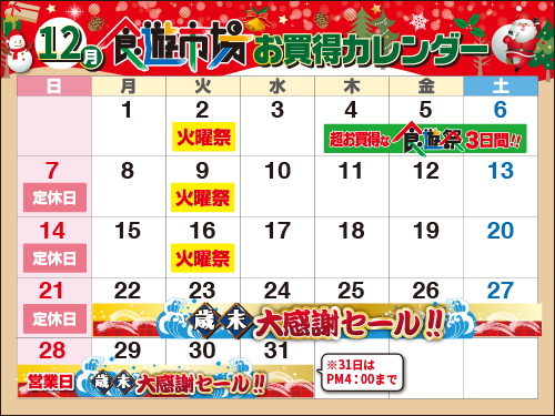 HOME 食遊市場からのお知らせ 火曜祭のチラシを公開しました。 食遊祭のチラシを公開しました。 リサイクルステーション OPEN!ご家庭にある資源を回収いたします。お買い物のついでに、ぜひお気軽にご利用ください。 食遊市場公式インスタグラムはじめました!随時お買い得情報満載!!是非ともご覧ください!! 下の画像をクリックすると拡大表示されます。 チラシ表面の保存用データはこちらから! 下の画像をクリックすると拡大表示されます。 チラシ裏面の保存用データはこちらから! フロアマップのPDFはこちら 店舗情報はこちら